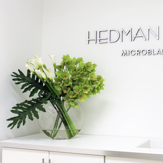 Vase Lune avec orchidées Vanda blanches et cymbidiums verts